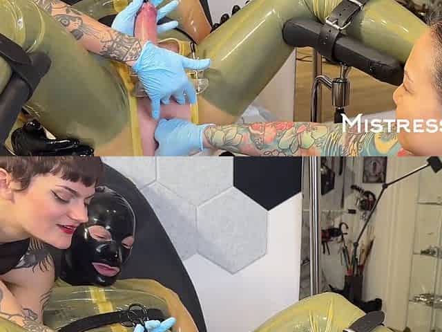 Madame Li Ying and Mistressae take control with ball punching and silicone sounding on their rubber gimp