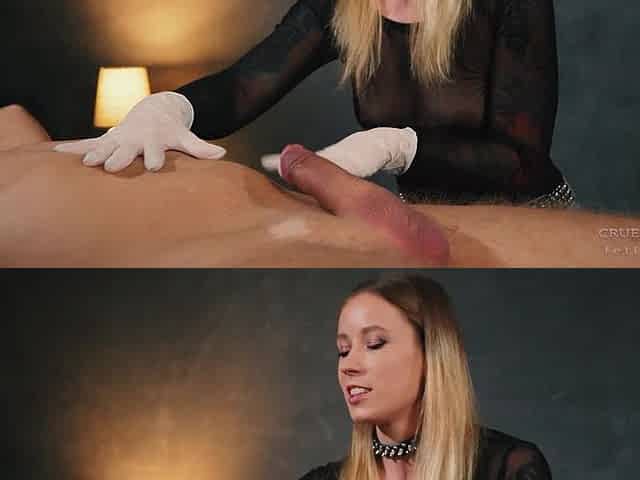 Femdom handjob. Dominatrix Nika jerks off slave's dick, but will he be allowed to cum?