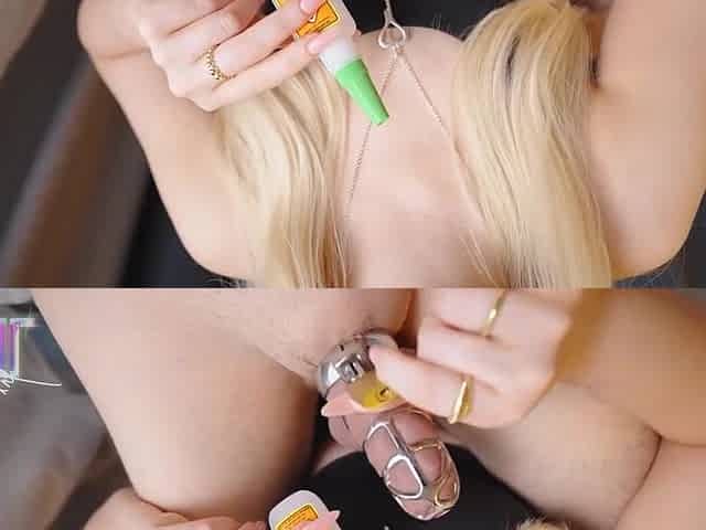 Mistress Makes Slave Erect, Cools His Dick with Ice Before Ejaculation, Then Teases and Denies Him with a Chastity Belt.