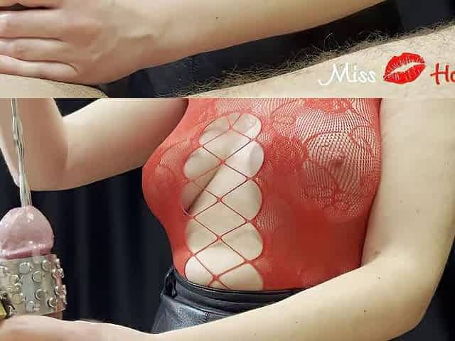 Fantastic pulsating ruined orgasm with spikes chastity on big dick. Amateur femdom handjob