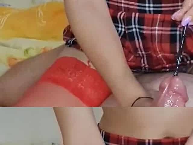 Sexy Step Sister Femdom Urethral Sounding Step Brother's Cock with Huge 12 Inch Dilator