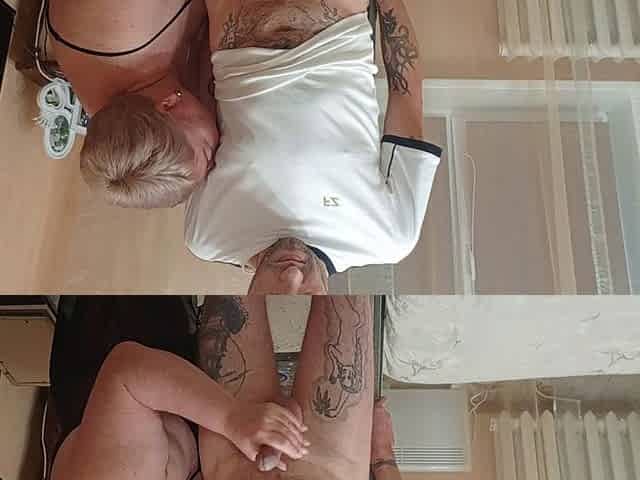 MILF in blue gloves gives handjob, sucks to cum in mouth