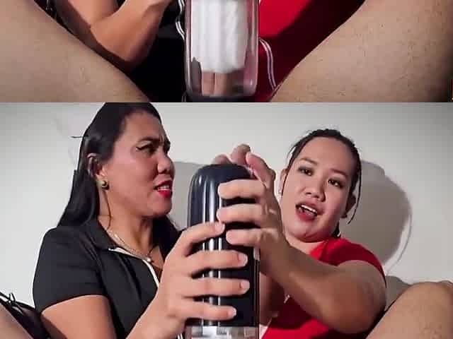 Dommina masseuses give bad HJ in a threesome with a tied cock