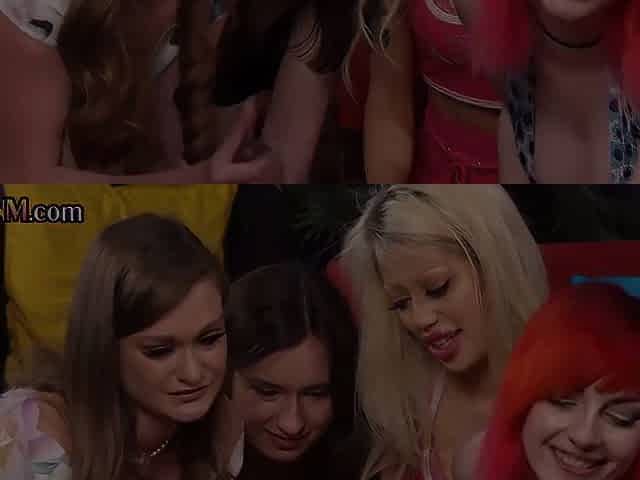 Pegging CFNM dominas fuck sissy in group action with dildo