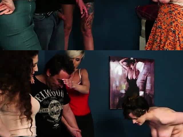 Sissy strapon fucked by group of amateur dominatrix babes