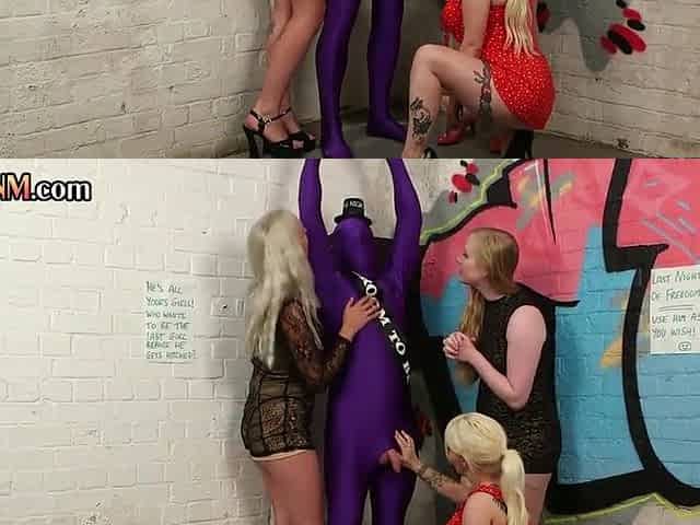 CFNM sluts deep throat and handjob tied up guy be4 cumshot