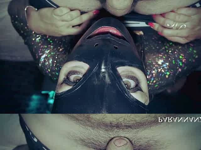 Mistress in BDSM latex jerks off the lower penis with a toy and hand until he cums