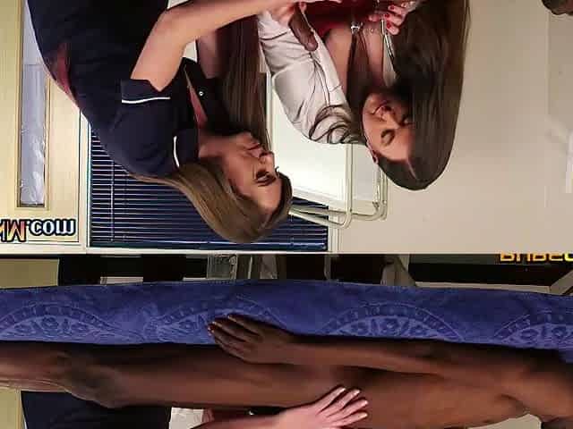 CFNM nurses in uniform and heels suck black cock in threesome