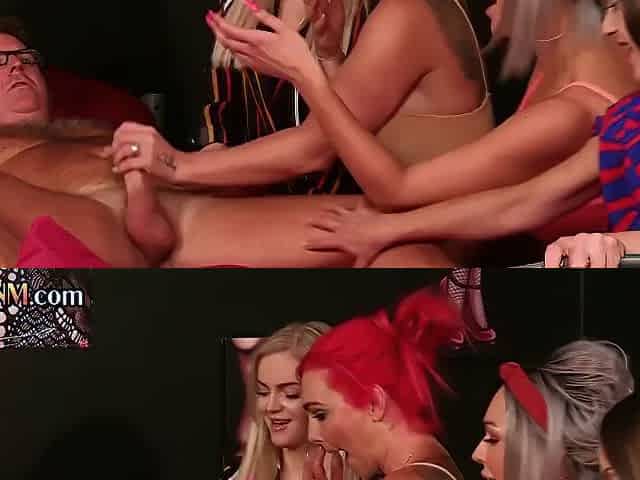 Clothed ladies from Britain indulge in wild group BJ and handjob session