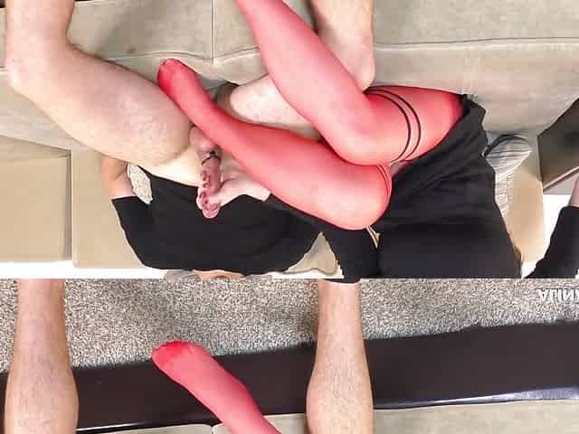 Hotwife gives a dirty talk while her inexperienced wife gives a blowjob, she allows him to cum on her feet as part of their fema