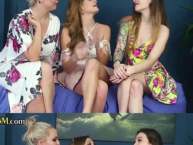 CFNM babes suck and jerk BBC in group