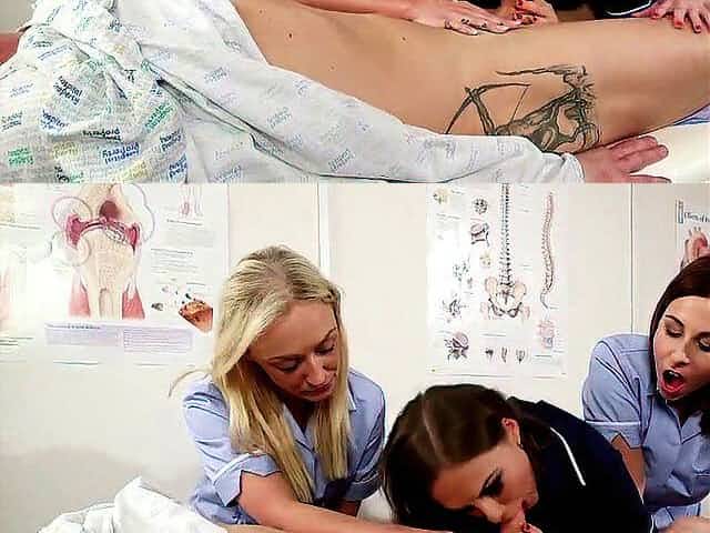 CFNM ladies gently suck and jerk submissive cock