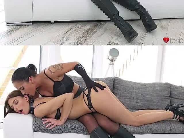 Lezdom wearing latex pet plays sweet teen 18+ by Femdom Austria