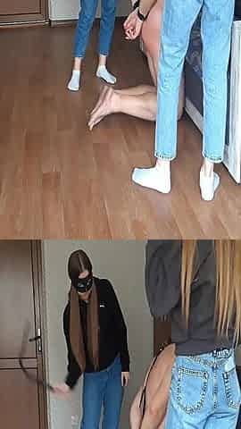 A serf cleans shoes for 2 Dominatrixes in latex, but the Mistresses are not cheerful with his work