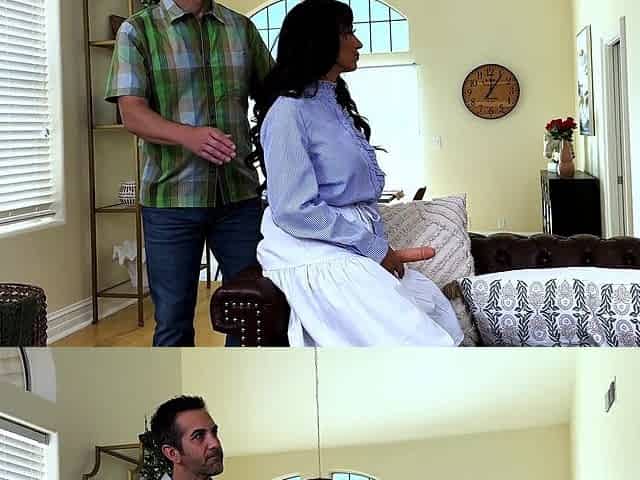 FFM threesome on the sofa with brunette Stacie Starr & Keegan