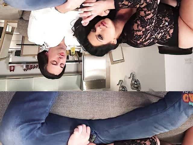 Raven Black gives her husband a rimjob and double blowjob threeway with teen babysitter Eve Evans.