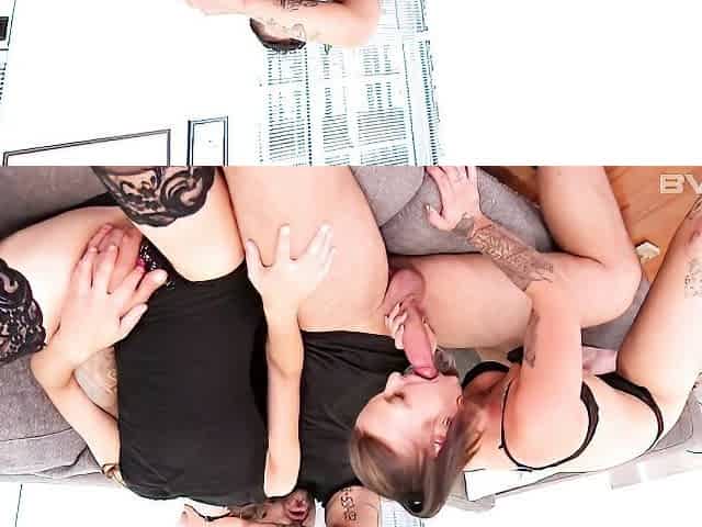POV babes enjoy 3some closeup pussynailing by big dick guy