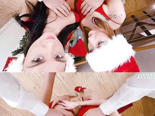 Sexy blondes Angelina Ashe and Juliana Jolene are naughty and nice at the office holiday party