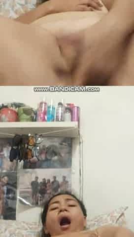 Massive cum shot pours out all over beautiful Pinay, cowgirl position.