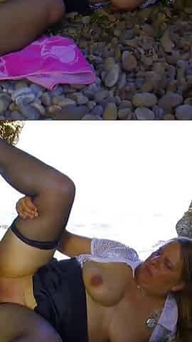 The MILF is a slut with huge breasts and a shaved vagina enjoying a cock inside her pussy on the beach