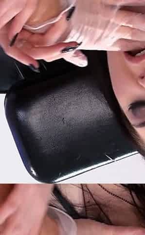 Hawt Brunette hair in Furry Coat and Fishnet Tights Masturbates Her Snatch with Her Fingers and Large Sex tool