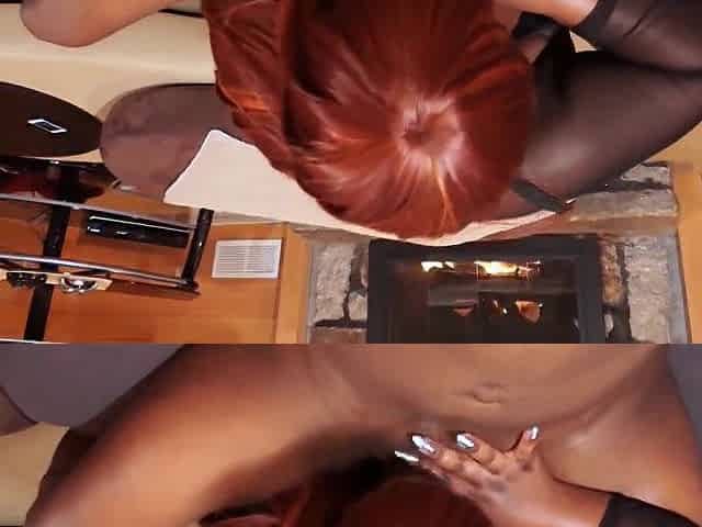 Redhead in fishnet and pantyhose entices cameraman, makes