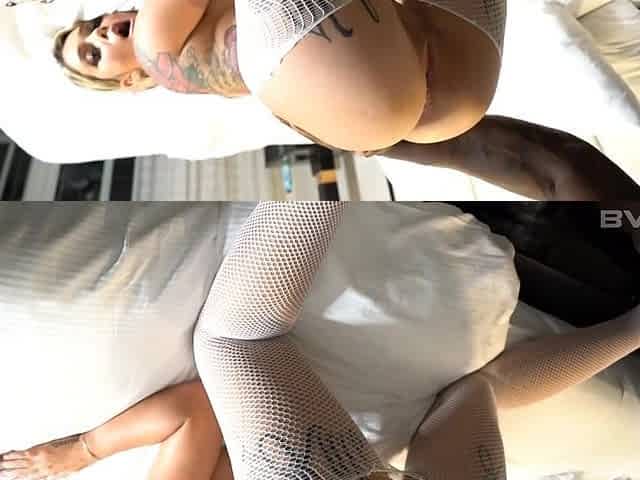 Thick blonde minx loves being slathered in oil while wearing fishnets and having anal sex