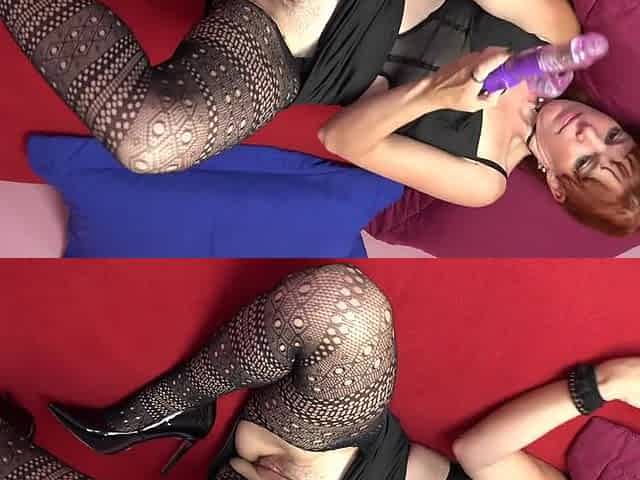 Massive sextoy, fishnet nylons and screwing machine