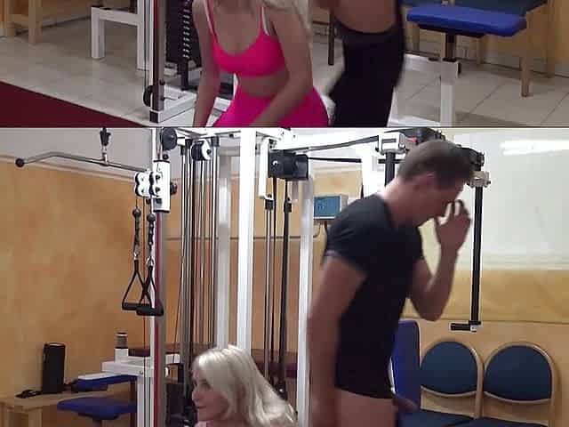 Man fingering pussy fitness blonde and orgasm in the training