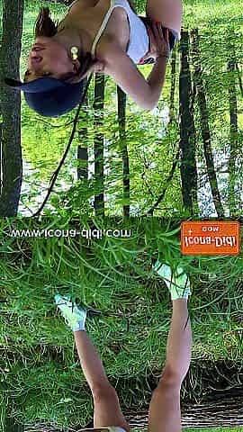 Красивая милфа с шикарной грудью делает растяжку в лесу и раздевается. Настоящий эксбиционизм.