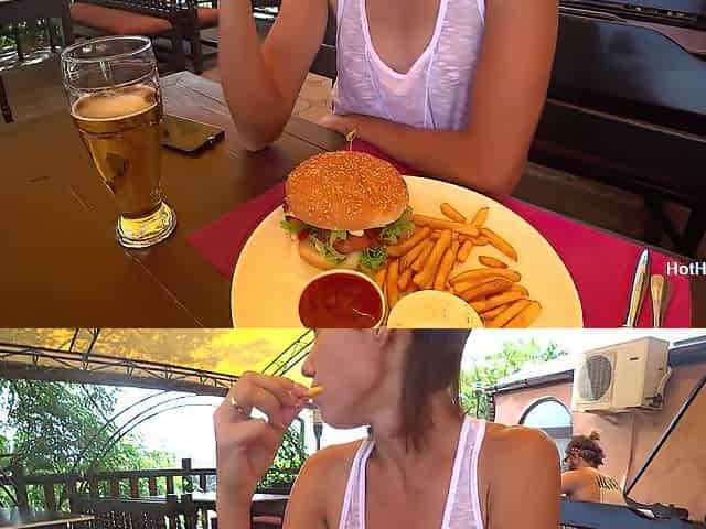 Eating burger and flashing in the cafe Transparent T-shirt No Brassiere (teaser)
