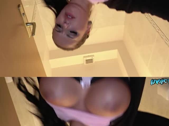 Lad places dick right between giant brunette boobs