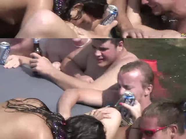 Lake party babes have a bit of lesbian sex for a big crowd