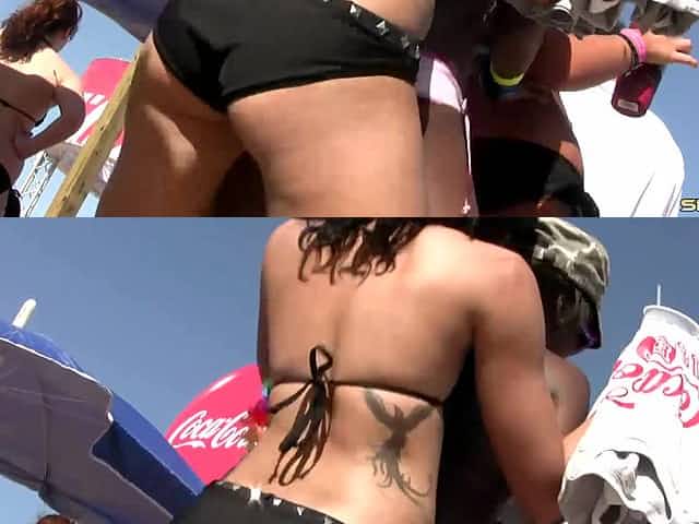 Provocative blonde dancing seductively at an outdoors bikini party