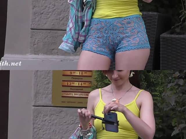 Jeny Smith walks in public with transparent shorts. Real flashing moments