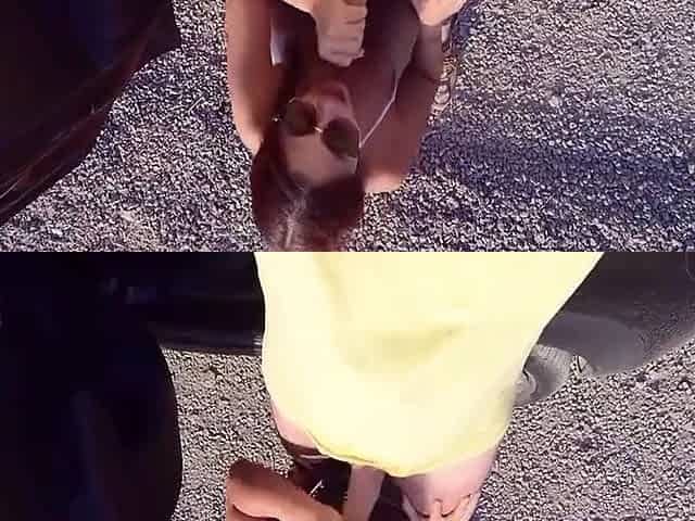 Ginger chick is kneeling on the floor and sucking cock as if she was a real pro