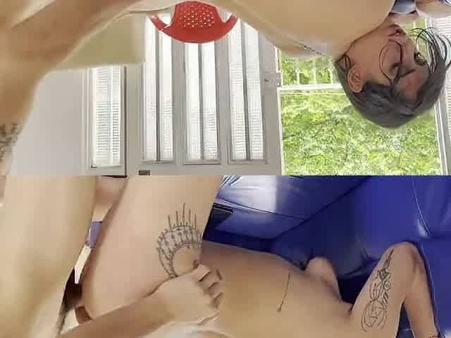 Lesbians sticks water gun nozzle in their cunts on floor