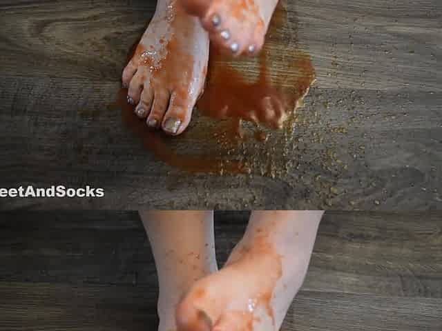 Feet Are Splashed With Tomato Sauce. Crush Food Crushing