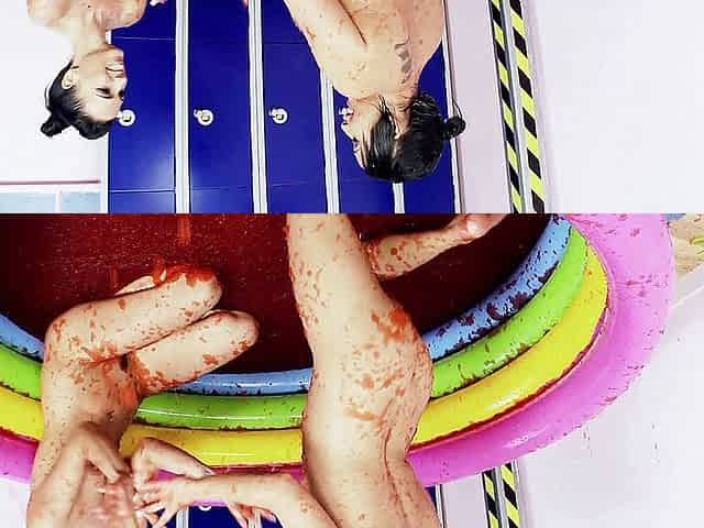 These busty British lesbians have a kink for food as they roll around and rub their shaved pussies