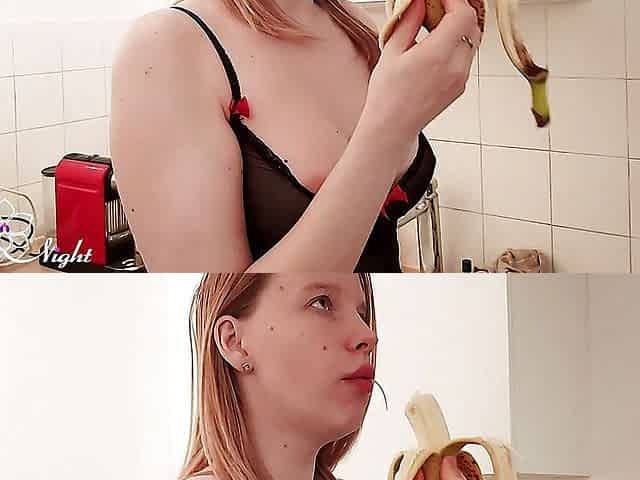 Cheerful maid without panties eats a lot of bananas in the dining room. ASMR 2