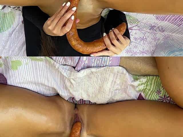Busty brunette MILF plays and masturbates pussy with big real sausages.