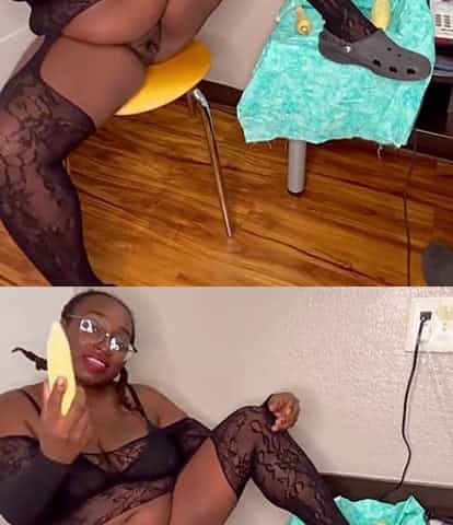 Beautiful Youthful Ebony Gal Stuffs Banana in Butt Rod in Cunt