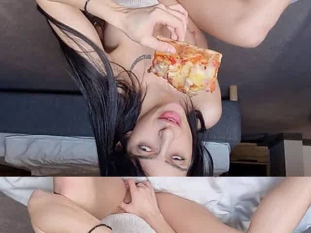 Layla is super skinny and super horny. She delivers a pizza and then gets nude on the kitchen table