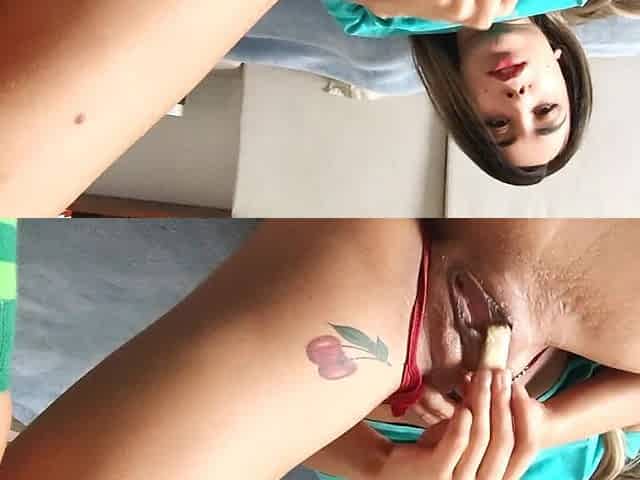 Dumb blond farm angel keeps screwing herself with her recent produce. Takes zucchini and squirts a lot