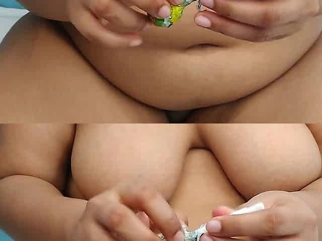 She feeds her pussy with a lollipop while her boyfriend is masturbating somewhere behind the scene