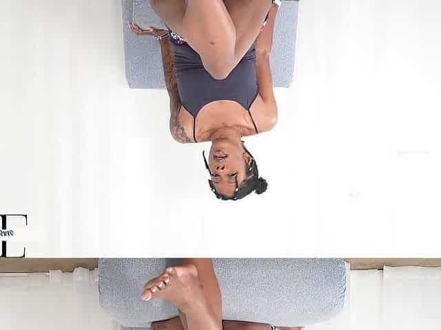 Ebony Girl Dangles Her Black Heels on the Edge of the Couch & Shows Her Feet Soles