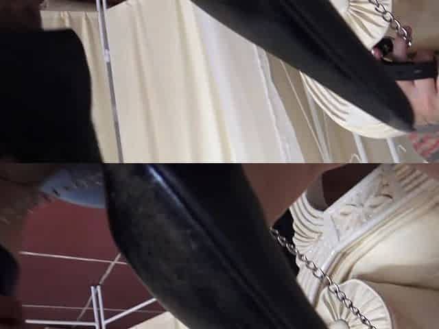 Obedient Slave in a Cage Sucks and Licks Mistress High Heels