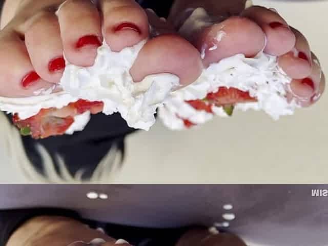Tasty dirty feet licking with whiped cream and squeezed strawsberries