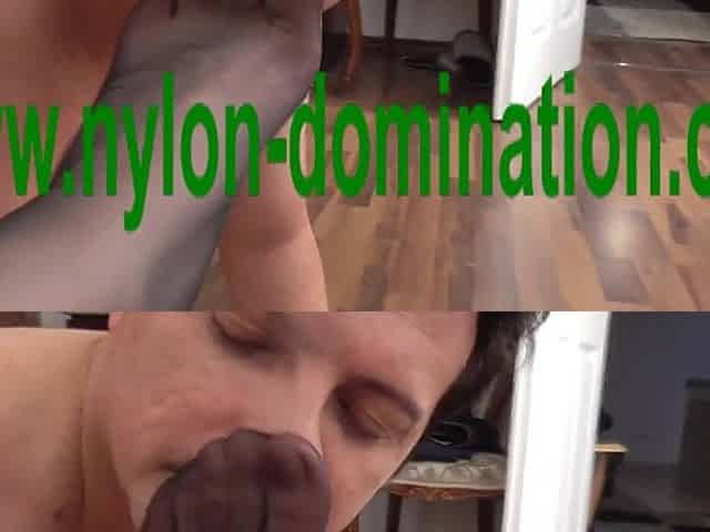 "Recently i bought nylon socks and today i decided to wear them my slave was kneeling on the floor with his cock hard"