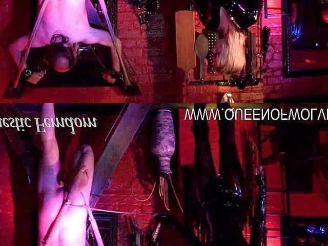 Big boobs girl in latex dress humiliating foot fetish with masked blonde kneeling down
